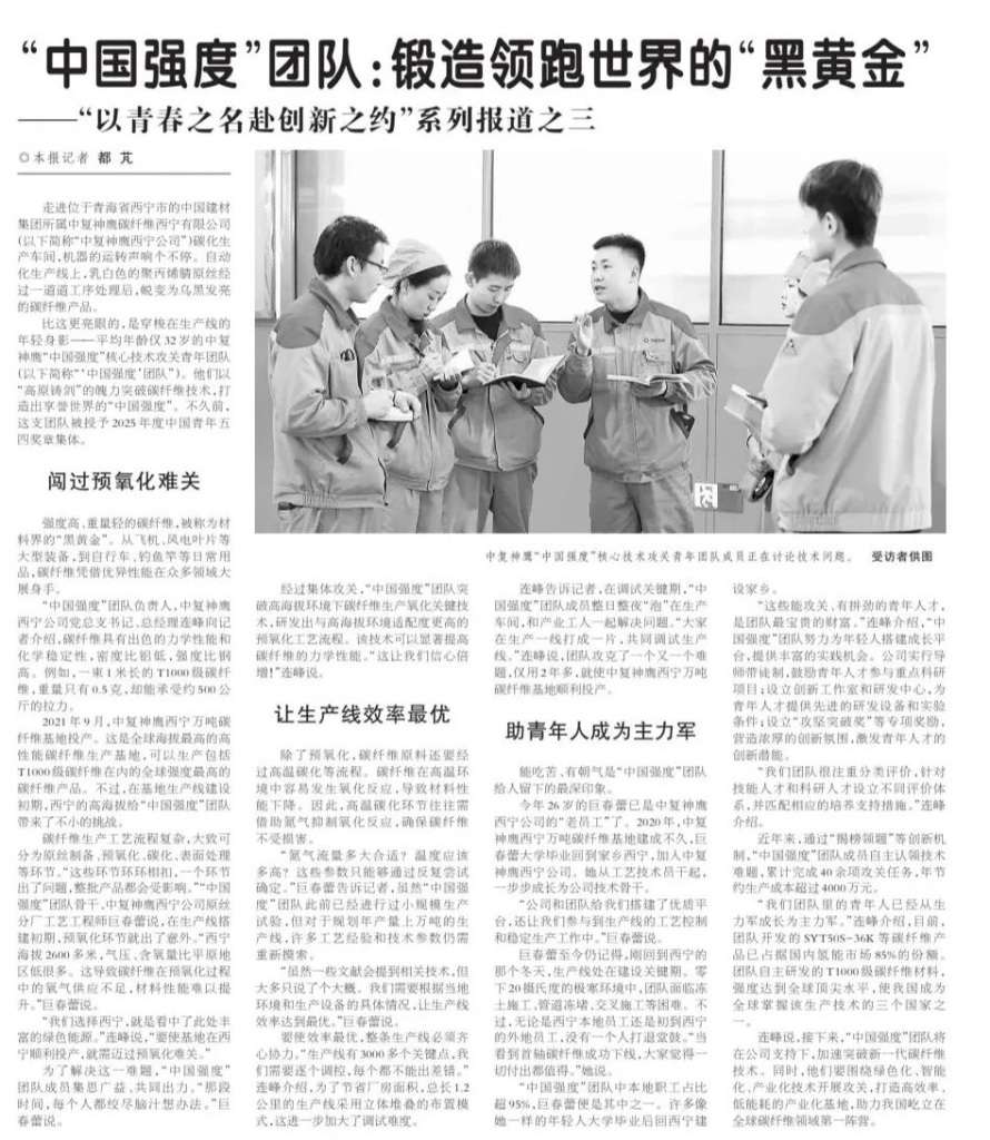比這更亮眼的,是穿梭在生產線的年輕身影——平均年齡僅32歲的中復神鷹“中國強度”核心技術攻關青年團隊(以下簡稱“‘中國強度’團隊”)。他們以“高原鑄劍”的魄力突破碳纖維技術,打造出享譽世界的“中國強度”。不久前,這支團隊被授予2025年度中國青年五四獎章集體。