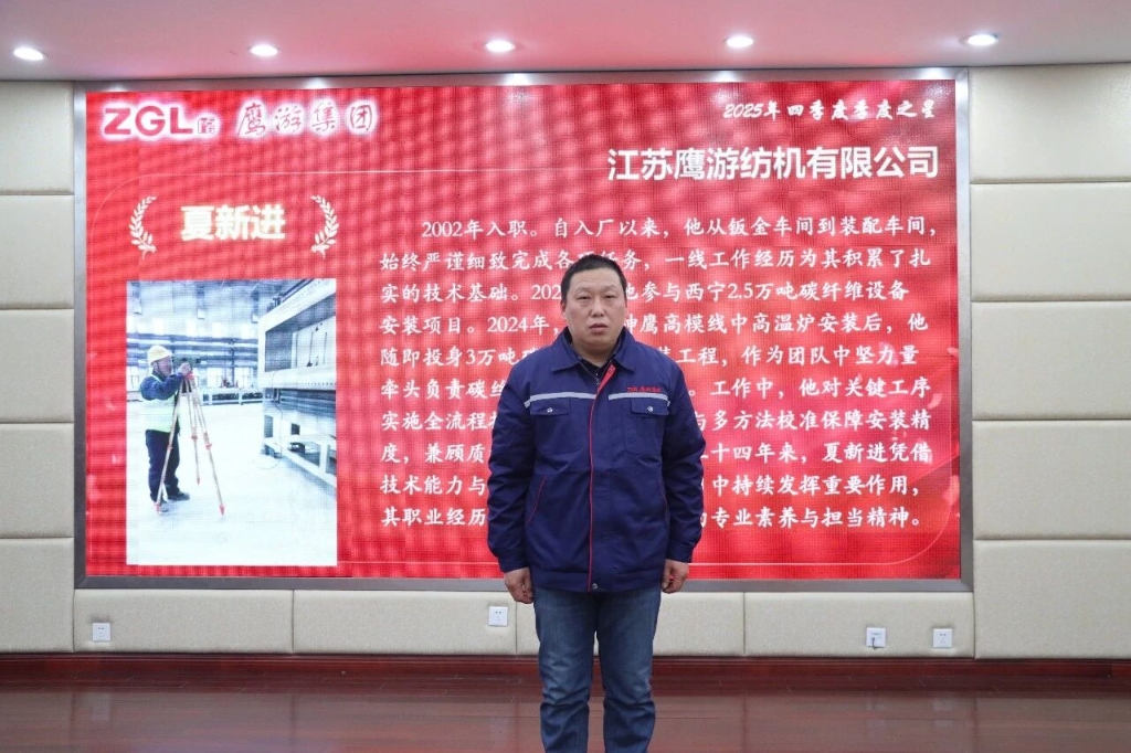 夏新進,2002年入職江蘇鷹游紡機公司,現(xiàn)任裝配車間操作工。他先后扎根鈑金、裝配車間一線,積累扎實技術(shù)功底。2020年,他遠赴海拔超2500米的高原,參與西寧2.5 萬噸碳纖維設(shè)備安裝項目。2024年完成神鷹高模線中高溫爐安裝后,隨即投身 3萬噸碳纖維設(shè)備工程,牽頭負責碳絲車間主體設(shè)備安裝。從業(yè)二十四載,他憑借過硬技術(shù)與責任擔當,在重點項目中彰顯一線技術(shù)人員的專業(yè)素養(yǎng)。