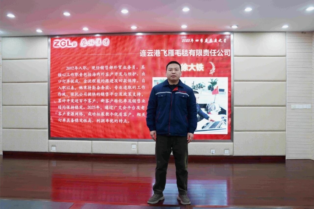 徐大鐵,2012年入職飛雁毛毯公司,現(xiàn)任銷售部外貿(mào)業(yè)務(wù)員,負責海內(nèi)外客戶開發(fā)維護、出口訂單促成、全流程履約跟進及回款保障。入職以來,他秉持勤奮務(wù)實、專業(yè)進取的作風,依托公司平臺與政策支持,累計開發(fā)近百個客戶,新客戶轉(zhuǎn)化率與銷售業(yè)績穩(wěn)居高位。2025年,他借力廣交會平臺及老客戶資源網(wǎng)絡(luò),成功拓展多個優(yōu)質(zhì)客戶,相關(guān)訂單穩(wěn)定性高、利潤率優(yōu),為公司2026年持續(xù)生產(chǎn)提供有力訂單支撐。