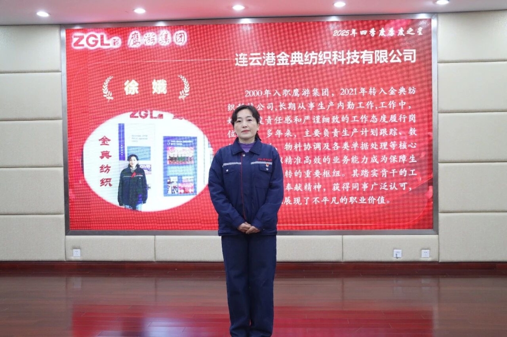 徐娥,中共黨員,2000年入職鷹游集團,2021年轉(zhuǎn)入金典紡織科技公司,長期深耕生產(chǎn)內(nèi)勤崗位。她秉持高度責任感與嚴謹細致的工作態(tài)度,負責生產(chǎn)計劃跟蹤、數(shù)據(jù)統(tǒng)計匯總、物料協(xié)調(diào)及單據(jù)處理等核心事務(wù),憑借對生產(chǎn)全流程的熟悉和出色的溝通協(xié)調(diào)能力,精準對接各部門需求,保障信息流與物流暢通,成為生產(chǎn)一線高效運轉(zhuǎn)的堅實后盾,其踏實肯干、敬業(yè)奉獻的作風贏得同事廣泛認可。