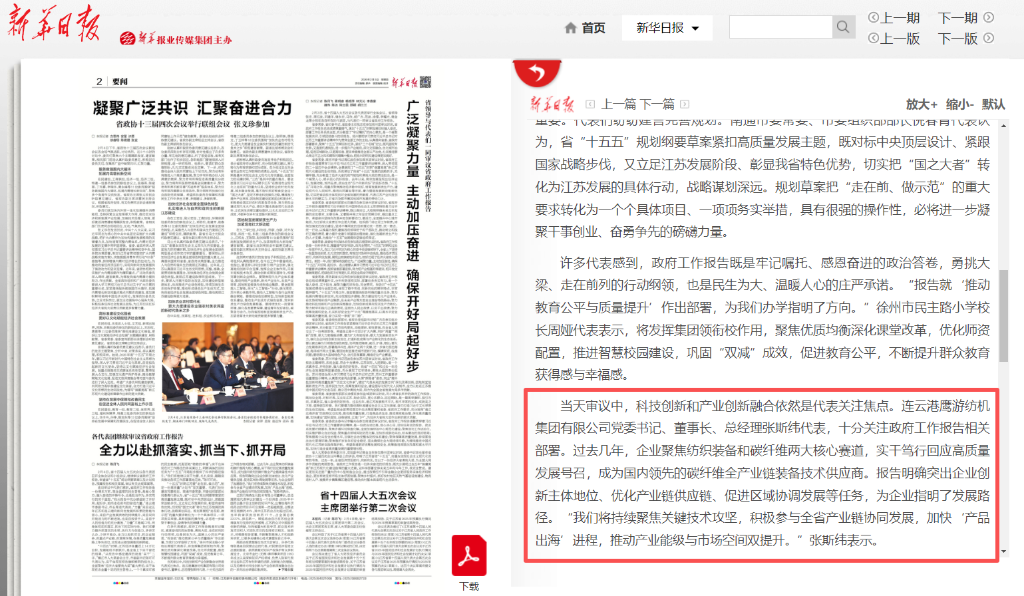 2月3日—6日,江蘇省第十四屆人民代表大會第五次會議在南京隆重召開。省人大代表、連云港鷹游紡機集團有限公司黨委書記、董事長、總經理,中復神鷹碳纖維股份有限公司副董事長張斯緯肩負使命、認真履職盡責,圍繞全省經濟社會高質量發展積極建言獻策,用實干踐行代表使命。